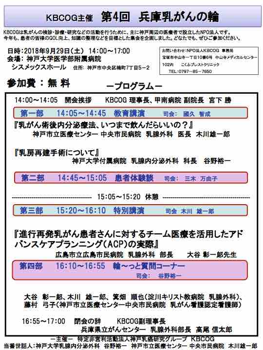 2018年9月29日 乳がん患者さんのQOL向上,知識の整理などを目指した集会を企画しました。 どなたでも参加可能ですのでご参集ください。